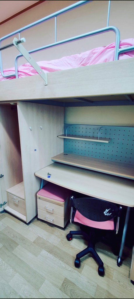 Das Wohnheim (auch „Dorm“ genannt, vom englischen Wort „dormitory“) ist zwar günstig, aber hat auch einige Regeln. Wir müssen zum Beispiel um 00:30 Uhr wieder im Gebäude sein, sonst gibt es einen Strafpunkt. Mit 7 Strafpunkten, die man auch anders sammeln kann, wird man verwiesen, also sind wir lieber vorsichtig. Wenn man unter der Woche länger draußen bleiben will, muss man einen Antrag bis 23:30 Uhr gestellt haben. Am Wochenende gibt es keine Strafpunkte, aber die gesamte Woche über ist der Dorm zwischen 00:30 Uhr und 5 Uhr früh über Nacht geschlossen. Das heißt, dass man entweder eine andere Schlafgelegenheiten wie ein AirBnB finden muss oder so lange wach bleiben muss. Deswegen muss man sich vorher immer gut überlegen, wie und wann man nach Hause kommt.