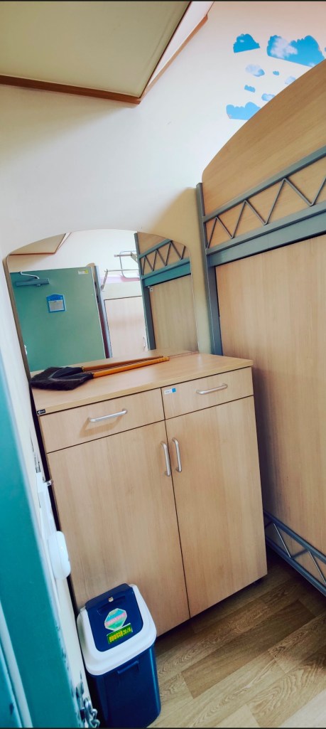 Natürlich sind wir genau zum Beginn der Mittagspause des Büros angekommen, also haben wir etwas gewartet und gequatscht, bevor wir einchecken konnten. Dazu wurden unsere Fingerabdrücke gescannt, damit wir durch den Scanner am Eingang kommen. Kathi und ich haben das gleiche Zimmer bekommen und haben uns beim Auspacken erstmal wie Schulkinder bei einem Schulausflug gefühlt. Den Schreibtisch hätten sie hier etwas kleiner und dafür den Schrank größer machen können, aber am Ende hat alles rein gepasst!