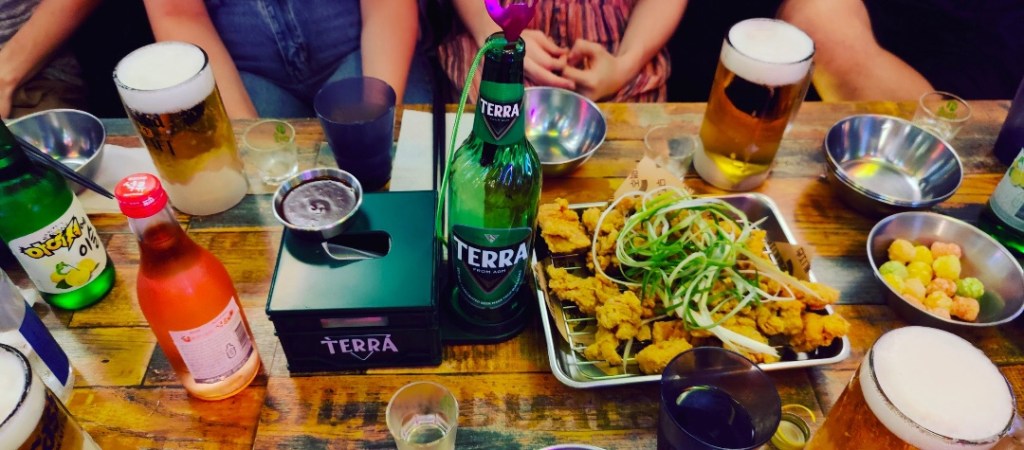 In Korea ist es üblich, in der Bar nicht nur zu trinken, sondern auch ganze Mahlzeiten zu essen. Da Korea grundsätzlich ein sehr Gemeinschafts-orientiertes Land ist, gehen viele auch gemeinsam Essen (und weil es tatsächlich teilweise günstiger ist als zu kochen…). Bier und deutsche Kultur in generell sind extrem beliebt, aber es schmeckt eher nach einem saurem Radler als wirklichem Bier. Außerdem wird hier extrem viel gekühlt – von den Innenräumen, Transportmitteln bis hin zu den Getränken. Es gibt auch Bier, welches in Gläser aus dem Gefrierfach eingeschenkt wird, sodass teilweise Eis mit drin schwimmt.